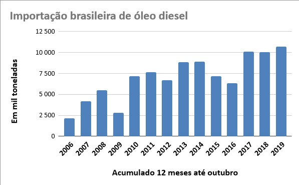 No acumulado dos 10 primeiros meses do ano, importamos US$ 5,3 bilhões em óleo diesel, aumento de 7% sobre o ano anterior.