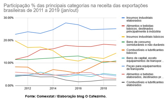 A principal categoria de produtos exportados pelo Brasil ainda é a de “insumos industriais elaborados”, que responderam por 25% das exportações em Jan/Out deste ano, ou US$ 46,7 bilhões, queda de 6% sobre o ano anterior.