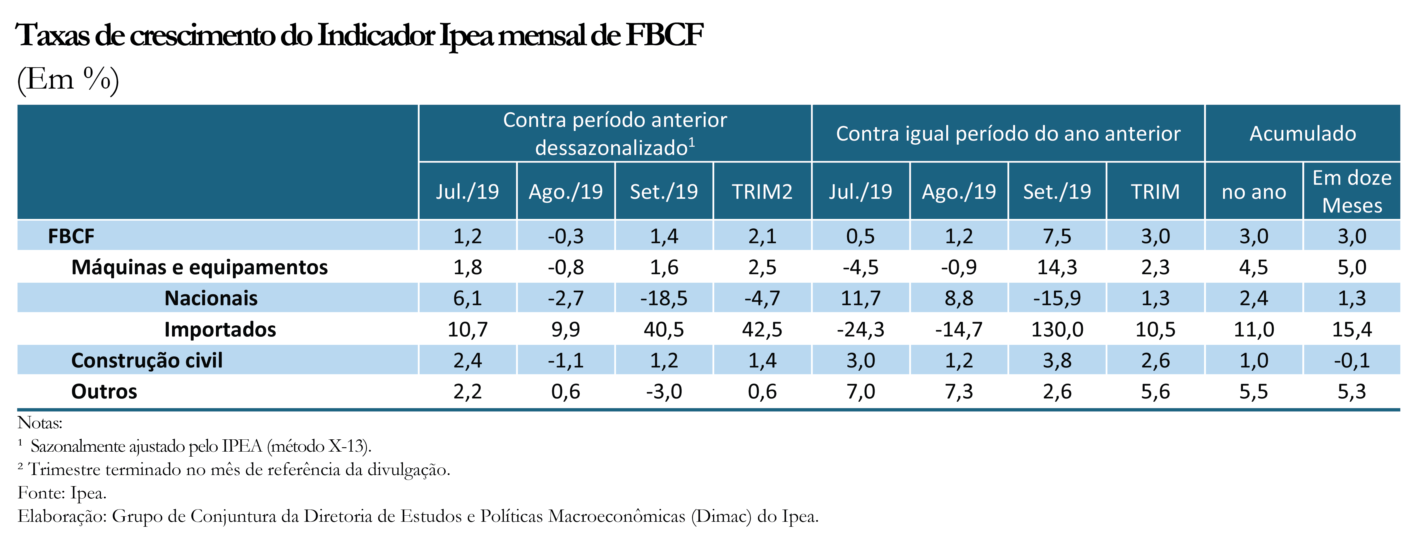 O Indicador Ipea Mensal de Formação Bruta de Capital Fixo (FBCF) registrou crescimento de 1,4% em setembro, na comparação com agosto, na série com ajuste sazonal. O resultado foi divulgado nesta terça-feira, 05, pelo Grupo de Conjuntura do Instituto de Pesquisa Econômica Aplicada (Ipea). FBCF é a denominação dos investimentos em aumento da capacidade produtiva da economia e na reposição da depreciação de seu estoque de capital fixo. Em relação a setembro de 2018, houve expansão de 7,5%.