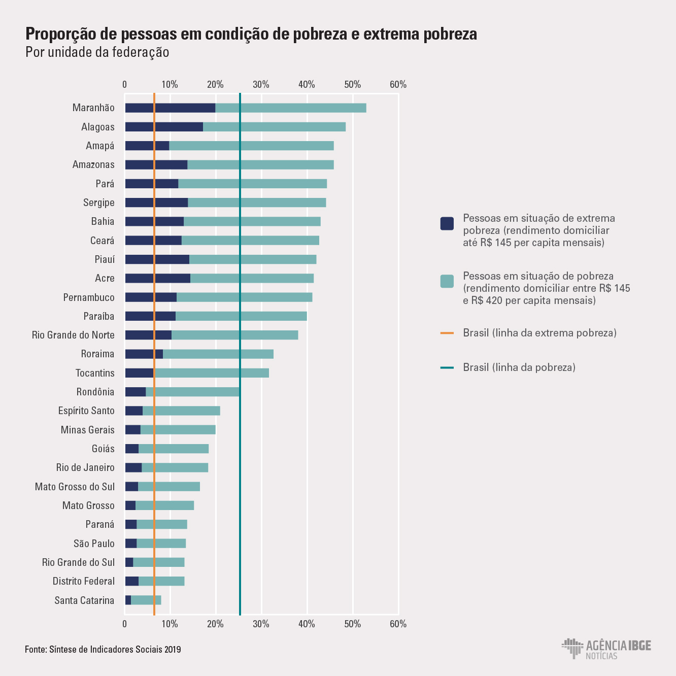 A Síntese de Indicadores Sociais também apontou que, embora um milhão de pessoas tenham deixado a linha de pobreza – rendimento diário inferior a US$ 5,5, medida adotada pelo Banco Mundial para identificar a pobreza em países em desenvolvimento como Brasil – um quarto da população brasileira, ou 52,5 milhões de pessoas, ainda vivia com menos de R$ 420 per capita por mês. O índice caiu de 26,5%, em 2017, para 25,3% em 2018, porém, o percentual está longe do alcançado em 2014, o melhor ano da série, que registrou 22,8%.