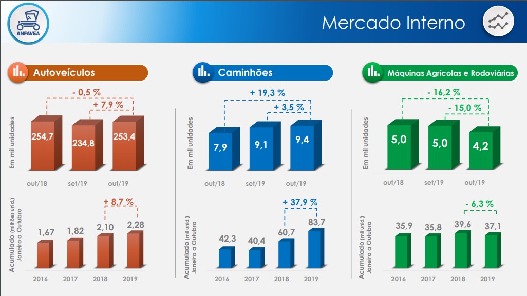 São Paulo, 6 de novembro de 2019 – A Associação Nacional dos Fabricantes de Veículos Automotores (Anfavea) apresentou o balanço da indústria automobilística em outubro e no acumulado dos 10 primeiros meses do ano.