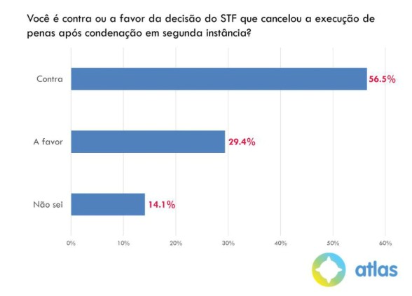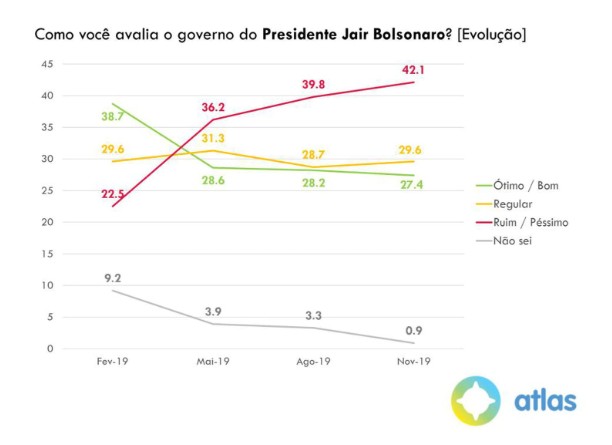 (…) Apoio a ditadura: A Atlas também mediu a opinião do eleitorado em outros assuntos. Por exemplo, 74,7% se dizem contrários a uma ditadura, enquanto que 14% são favoráveis e 11,3% não souberam opinar. Além disso, 52,1% acreditam que a corrupção está aumentando. Nesta mesma linha, 56,6% sentem que a criminalidade também está subindo, apesar de os dados de 2018 e deste ano indicarem o contrário.