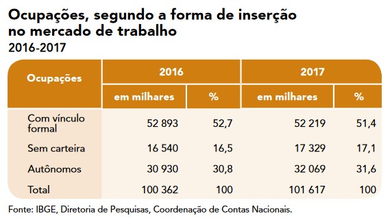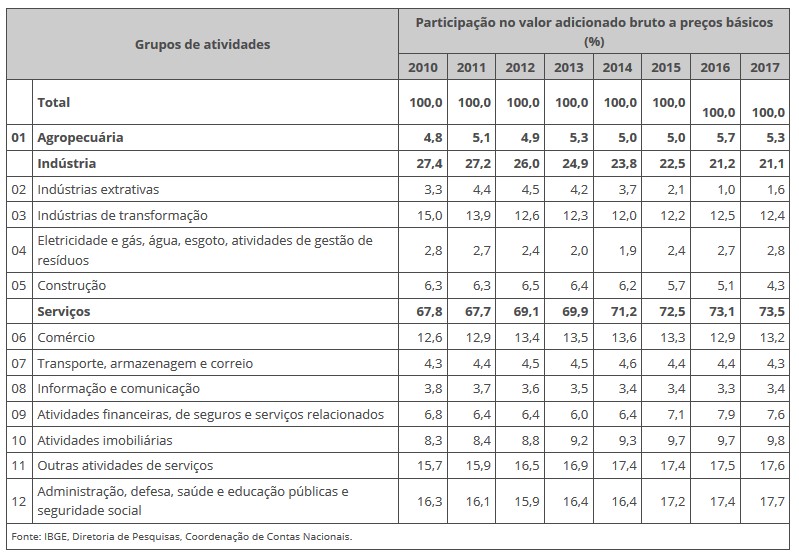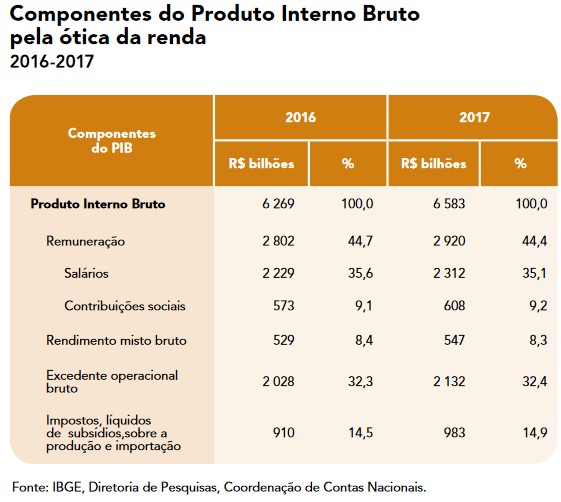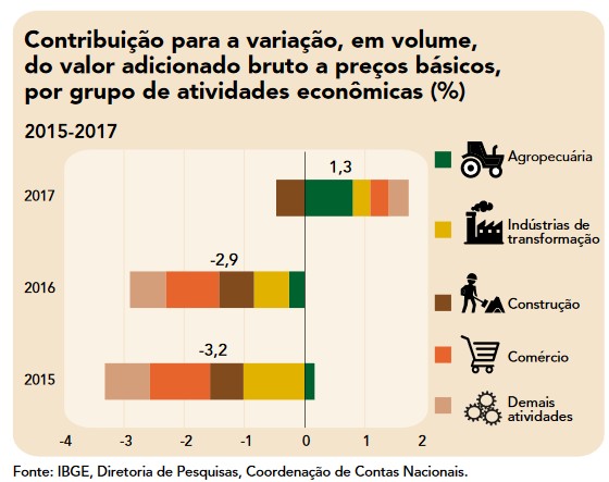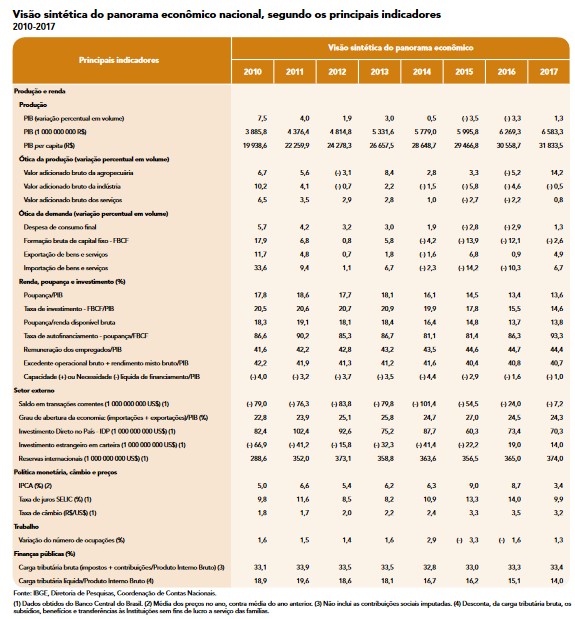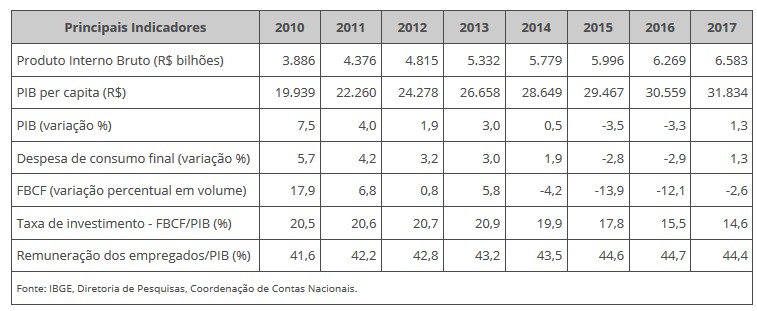 Em 2017, o Produto Interno Bruto (PIB) voltou a crescer (1,3%), após a queda acumulada de 6,7% no biênio 2015-2016. Em valores correntes, o PIB em 2017 foi de R$ 6,583 trilhões, o que corresponde a um PIB per capita de R$ 31 833,50. O crescimento do PIB per capita foi de 0,5% levando seu patamar a ficar próximo, em termos reais, ao observado em 2010. O crescimento do PIB em 2017 foi resultado de um aumento de 1,3% do Valor Adicionado Bruto – VAB e de 1,8% dos Impostos sobre produtos, líquidos de subsídios.