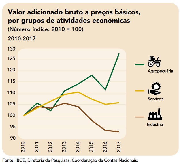 A Indústria de Transformação cresceu 2,3% no ano, interrompendo uma série de três anos consecutivos de queda. As atividades que mais contribuíram para esse crescimento da Indústria de transformação foram a Fabricação de equipamentos de informática e a Fabricação de automóveis que registraram elevação em volume de 23,3% e 18,5%, respectivamente. Apesar do crescimento observado no ano de 2017, em termos de volume do Valor Adicionado Bruto, a Indústria de transformação ainda se encontrava num nível 15,0% abaixo do seu patamar máximo, observado no ano de 2013.