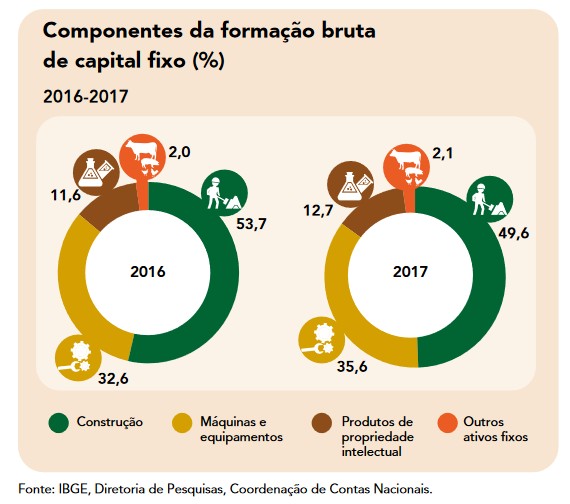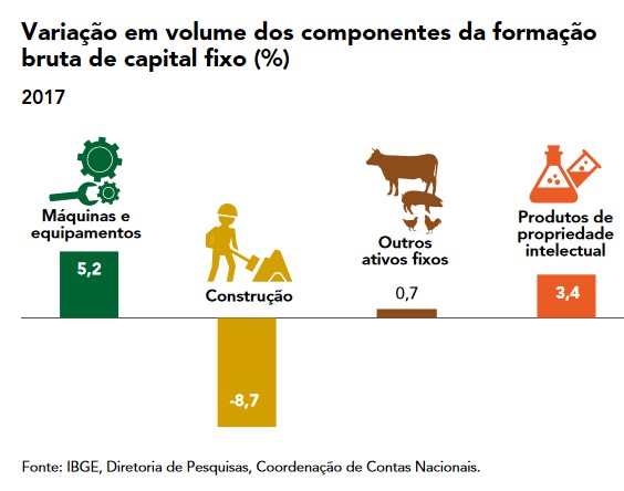 A Construção foi o único dos componentes da FBCF com retração de volume em 2017 (-8,7%). Ao contrário de 2016, todos os demais componentes tiveram variação positiva: Máquinas e equipamentos (5,2%), Produtos de propriedade intelectual (3,4%) e Outros ativos fixos (0,7%).