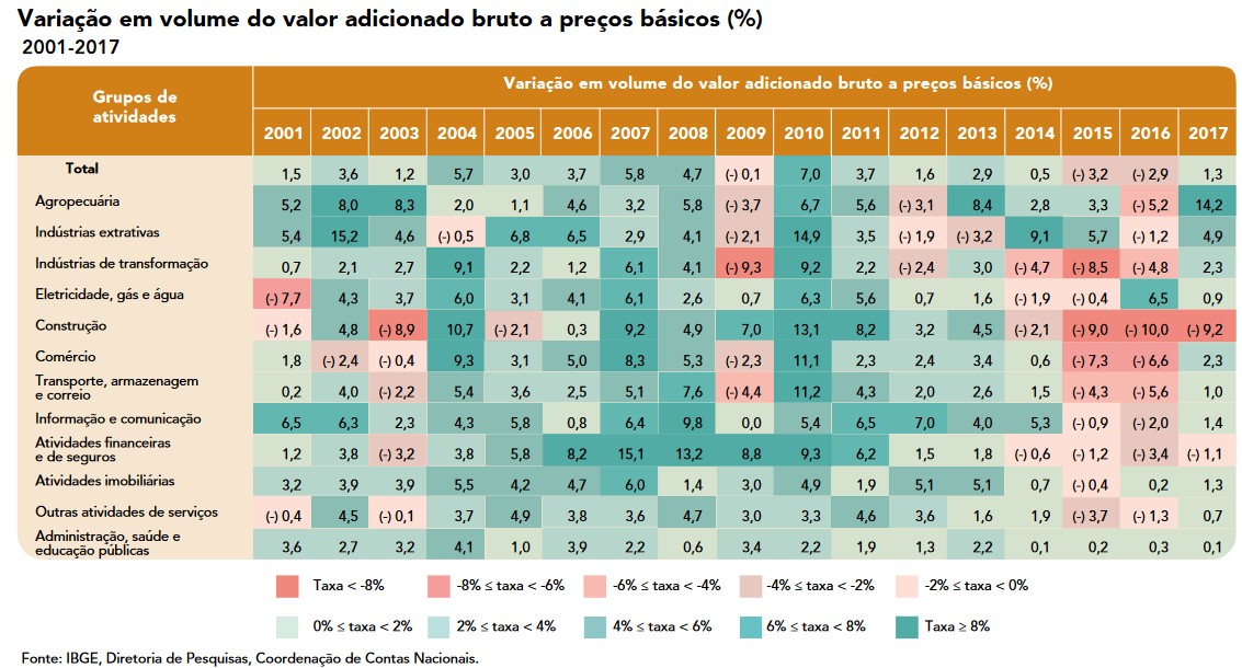 Em 2017, os únicos grupos de atividades da economia em que o valor adicionado bruto recuou foram Construção (-9,2%) e Atividade financeira e seguros (-1,1%). A atividade Construção mantém desde 2014 uma série de resultados negativos, que resultaram em uma queda acumulada de 27,3% no volume do Valor Adicionado Bruto da atividade, além da perda de aproximadamente um terço de sua participação no PIB (6,4% em 2013, contra 4,3% em 2017). Pelo lado dos usos, o principal responsável por essa redução da produção da atividade foi a queda dos investimentos, observada em todos os segmentos da Construção. Em 2017 os investimentos em Edificações caíram 8,3%, em Obras de infraestrutura se reduziram 11,8% e em Serviços especializados da construção recuaram 7,2%.