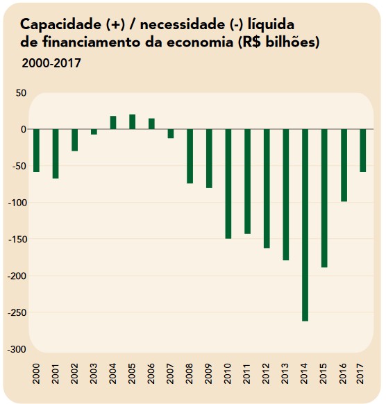 A necessidade líquida de financiamento da economia brasileira em 2017 foi de R$ 67,4 bilhões, registrando uma queda nominal de 31,1% em relação ao ano anterior (R$ 97,8 bilhões). Essa melhora foi influenciada basicamente pelo desempenho do comércio exterior e pelo recuo das rendas líquidas de propriedades enviadas ao resto do mundo. O saldo externo de bens e serviços foi de R$ 47,3 bilhões, com incremento nominal de 88,8% (R$ 22,2 bilhões). Já o envio líquido de rendas de propriedade recuou R$ 134,0 bilhões em 2017, contribuindo com R$ 10,0 bilhões na redução da necessidade de financiamento do país.