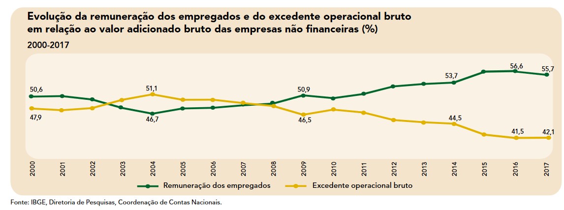 A participação da remuneração na renda disponível das famílias apresentou trajetória de crescimento até 2011, quando atingiu o patamar máximo na série de 65,3% do total. Todos os anos seguintes registraram queda nessa relação, que era de 62,1% em 2017.