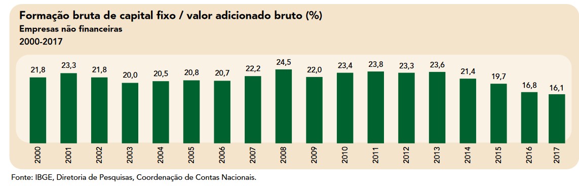 Em 2017, a Formação Bruta de Capital Fixo (FBCF) caiu 2,6% e a taxa de investimento (14,6%) chegou ao seu menor nível desde 1995.