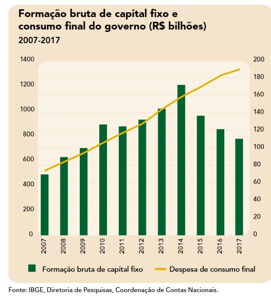 Em relação aos usos, mantendo a tendência de queda dos últimos dois anos, a formação bruta de capital fixo do governo geral passou de R$ 121,2 bilhões em 2016 para R$ 109,2 bilhões em 2017, registrando um decréscimo, em termos nominais, de cerca de 9,9%. Este movimento foi influenciado especialmente pela queda dos investimentos na esfera municipal. A despesa de consumo final do governo cresceu 3,9% em termos nominais.