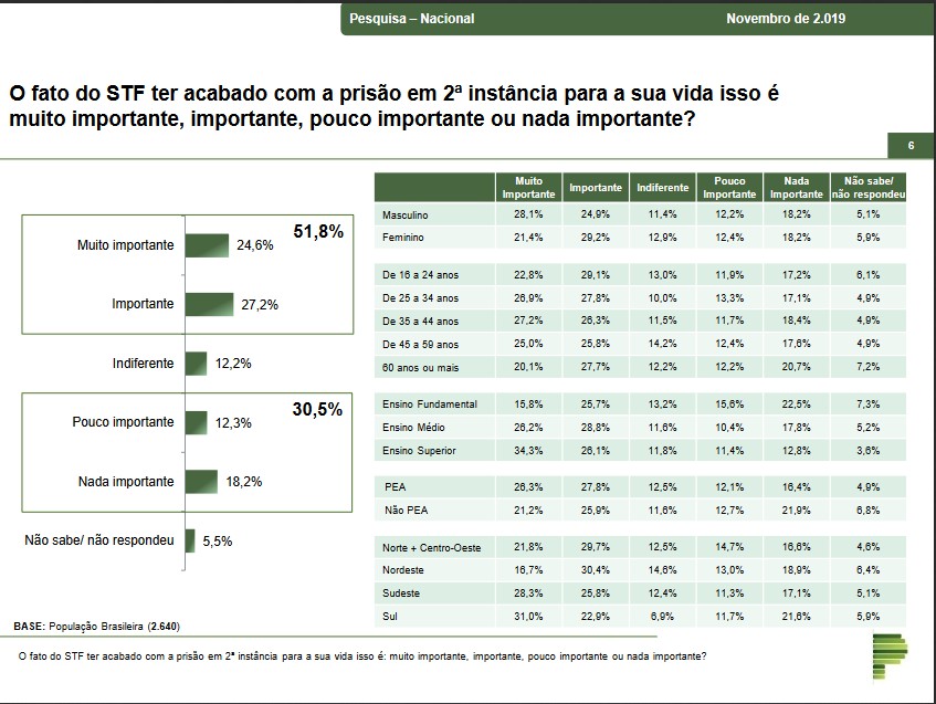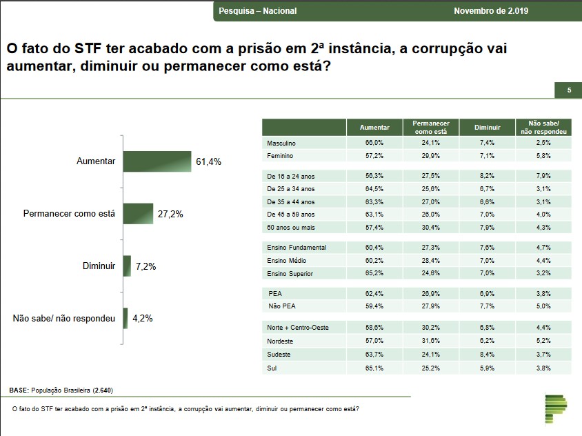 O instituto Paraná Pesquisas divulgou hoje uma sondagem sobre a opinião dos brasileiros acerca da prisão em segunda instância.