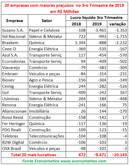 O lucro líquido consolidado no 3° trimestre de 2018 das 20 empresas com maiores prejuízos em 2019 foi de R$ 672 milhões, contra prejuízo consolidado de R$ 9,47 bilhões no 3° trimestre de 2019.