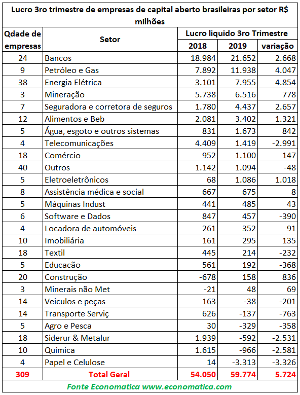 O lucro consolidado de 309 empresas brasileiras de capital aberto no 3º trimestre de 2019 é de R$ 59,7 bilhões contra R$ 54,0 bilhões no mesmo período de 2018, o que representa crescimento de R$ 5,72 bilhões ou 10,6%.