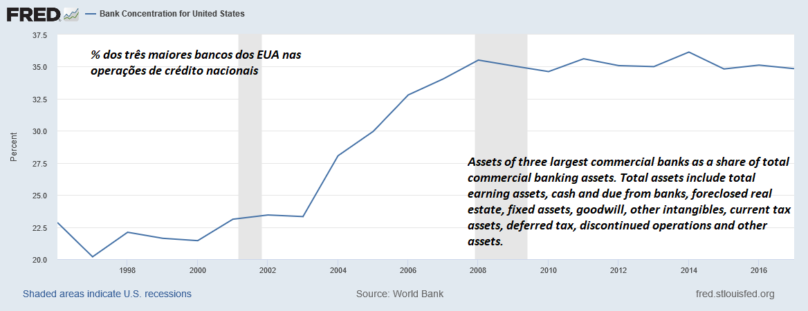 [Comentário meu: essa descentralização se estende até o final da década de 90; até hoje, os EUA possuem mais de 5 mil bancos; o nível de concentração no país ainda é muito inferior ao registrado na Europa e no Brasil. Confira o gráfico abaixo.]
