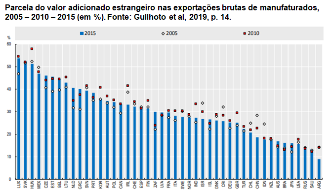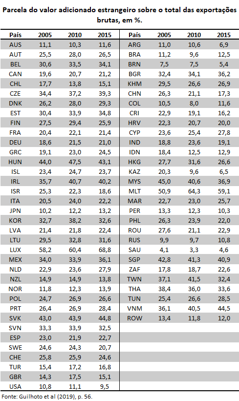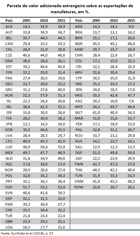 Por exemplo, os EUA que apresentaram indicadores para trás nas exportações brutas totais de 11,1% e 9,5% em 2010 e 2015, respectivamente, no caso das manufaturas assinalaram 17,7% e 15,6% naqueles anos. A China, registrou 21,1% e 17,3% de valor adicionado importado nas exportações totais em 2010 e 2015, respectivamente, e 22,6% e 18,7% nas de produtos manufaturados.