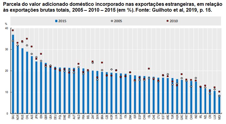 • O valor adicionado do Brasil incorporado nas exportações estrangeiras caiu de 23,9% do total das exportações brutas do Brasil em 2010 para 19,6% em 2015 e de 21,1% para 15,2% no caso de manufaturas. Em 2015, estes indicadores, respectivamente, foram 21,9% e 16,2% nos países não pertencentes à OCDE.