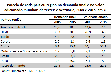 Têxteis e vestuário. A China ocupou o lugar da Europa e da América do Norte tanto na demanda final quanto na produção de têxteis e vestuário entre 2005 e 2015, ganhando 7 e 15 pontos percentuais, respectivamente. Desta forma, passou a ser a principal produtora mundial, com parcela de 31% no valor adicionado mundial e a segunda maior consumidora.
