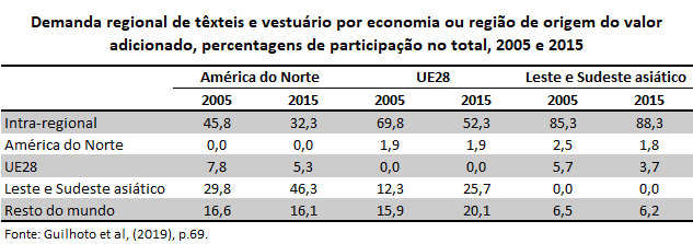 Embora a China, em geral, seja o país responsável pela maior parte desse valor adicionado estrangeiro, perde para algumas economias do bloco UE28, como a Irlanda, República Tcheca, Letônia, Grécia, Lituânia, Luxemburgo e Portugal. Aliás, a participação intrarregional na Europa continua alta, mas diminuiu de 70% para 52%, neste setor de 2005 para 2015. Porém, no Leste e Sudeste Asiático a demanda intrarregional de têxteis e vestuário está próxima dos 90%.