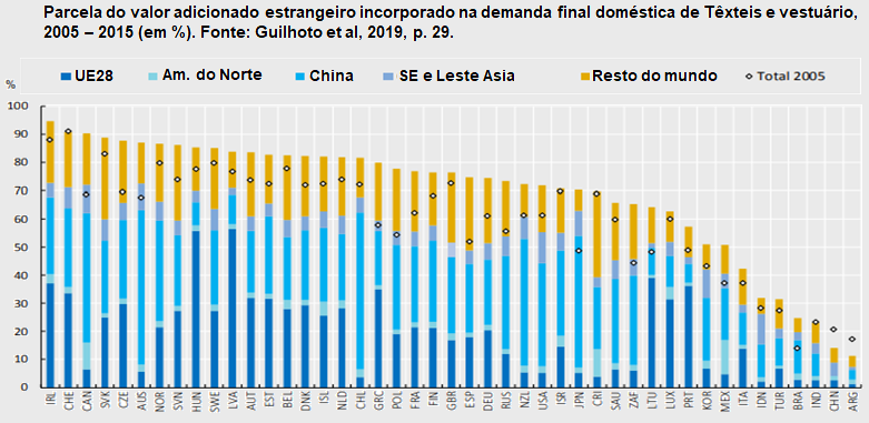 Na maior parte dos países, a participação do valor adicionado estrangeiro incorporado na demanda final de têxteis e vestuário ultrapassou 70% (sendo superior a 90% na Irlanda e na Suíça), com exceções notáveis como os emergentes de renda média: Argentina, China, Índia, Brasil, Turquia, Indonésia, México; mas também Itália e Coreia.
