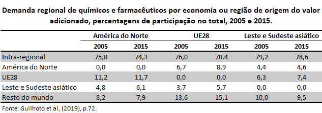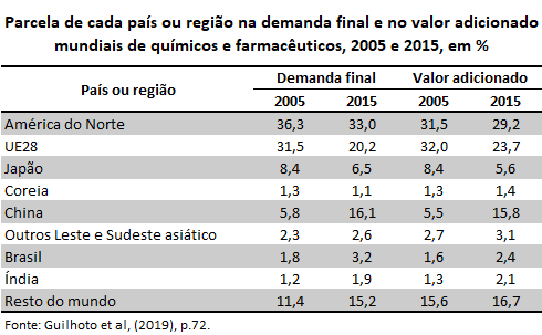 Por usa vez, as parcelas do Brasil na demanda e no valor adicionado globais de produtos químicos e farmacêuticos em 2015, foram 3,2% e 2,4% – denotando seu maior peso enquanto consumidor. Nestas cadeias, a participação brasileira se intensificou na década, pois em 2005 foi, respectivamente, 1,8% e 1,6%.