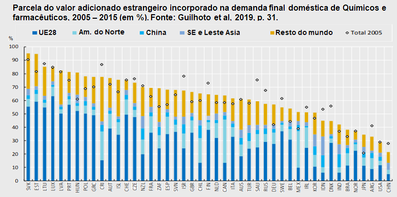 Quase a metade dos países diminuiu sua dependência de fontes estrangeiras de valor agregado na demanda final doméstica na década analisada. Ainda assim, a participação do valor adicionado estrangeiro incorporado na demanda final de químicos e farmacêuticos foi inferior a 50% em 2015 somente na China, Estados Unidos, Argentina, Japão, Noruega, Brasil, Índia, Dinamarca, Indonésia. Então, em 2015 o valor estrangeiro incorporado na demanda final brasileira era de 38,3%, sendo 11,5 p.p. da UE28; 9,1 p.p. da América do Norte e somente 4 p.p. da China.