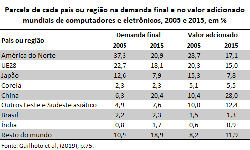 O Brasil manteve participação modesta na demanda final global de computadores e eletrônicos, com 2,2% em 2005 e 2,3% em 2015, que foi quase o dobro da participação no valor adicionado, respectivamente, 1,5% e 1,3%.