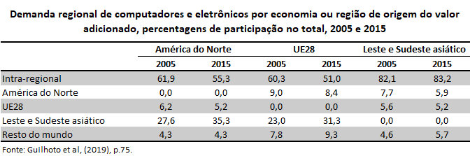 Por outro lado, houve aumento do peso intrarregional na origem da demanda final do Leste e Sudeste asiático, essencialmente advindo das atividades da indústria de transformação, como decorrência do fortalecimento da dinâmica econômica regional sob liderança chinesa. Sua parcela passou de 22,4% para 55,8% do valor intrarregional da demanda final de manufaturas e serviços de negócios, e de 31,4% para 63,3% somente em manufaturas – em substituição essencialmente ao Japão, mas também Coreia e Taiwan.