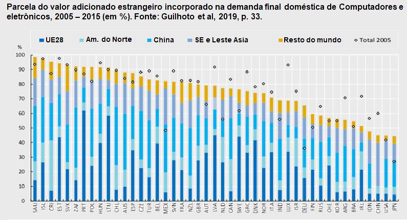 Em 2015, a ampla maioria dos países possuía participação do valor adicionado estrangeiro incorporado na demanda final de TIC e eletrônicos superior a 60%, chegando a mais de 90% na Arábia Saudita, Islândia, Costa Rica, Estônia e Eslováquia. Por outro lado, os países com as menores parcelas de valor adicionado estrangeiro na sua demanda final eram Japão, Estados Unidos, China, Indonésia, Irlanda, Brasil e Argentina.