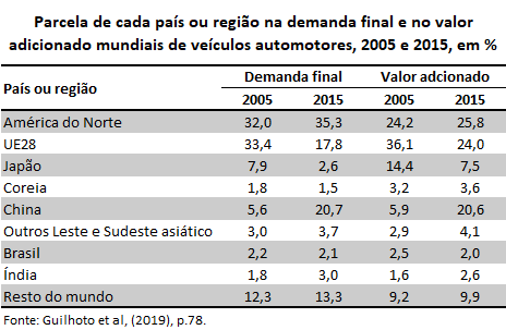 Veículos automotores. Neste caso, a América do Norte ganha parcela na demanda final e no valor adicionado de 2005 a 2015. UE28 e Japão, entretanto, assinalam quedas expressivas tanto na produção quanto na demanda mundiais, substituídos pela China que passa a responder por 21% de ambos. Nas cadeias de veículos automotores, os pesos do Brasil na demanda e na produção mundiais em termos de valor adicionado são mais equilibrados, respectivamente, 2,0% e 2,1% em 2015, com ligeira redução em relação a 2005 (2,2% e 2,5%).