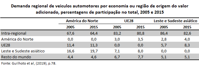 Grande parte da demanda importada manteve-se intrarregional em dez anos, de modo que essa indústria é mais regionalizada em abastecimento do que o setor têxtil. Somente no Leste e Sudeste da Ásia se viram alterações fortes no peso dos países como origem da demanda, com substituição do Japão pela China.