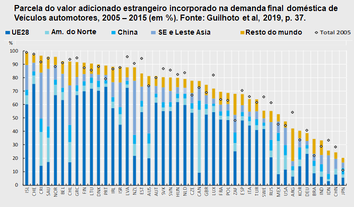 Para mais da metade dos países, mais de 70% do valor adicionado é proveniente de fora do país. O valor adicionado estrangeiro na demanda final de veículos automotores supera 90% na Islândia, Suíça, Costa Rica, Arábia Saudita, Noruega, Bélgica, Chile e Grécia. No outro posto, os outros países alcançam menor parcela da demanda final no Japão, China, Indonésia, Índia e Brasil. Desse modo, a parcela do valor adicionado estrangeiro incorporado na demanda final do Brasil em 2015 foi de 34,4%, sendo 8,8 p.p. da UE28, 5,6 p.p. da América do Norte, 5,2 p.p. dos outros países do Leste e Sudeste Asiático exceto China (3,8 p.p.).