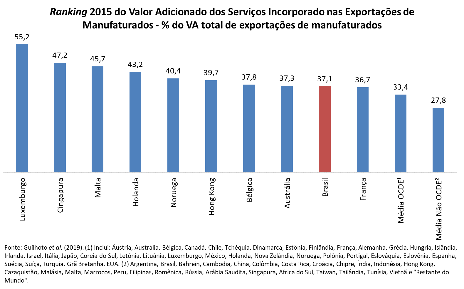 Em 2015, o Brasil foi um dos países com maior percentual de serviços incorporado nas exportações de manufaturados (37,1%), atrás de Luxemburgo, Singapura, Malta, Holanda, Noruega, Hong Kong, Bélgica e Austrália. Ademais, o Brasil se caracteriza por um maior conteúdo doméstico dos serviços incorporados nas exportações de manufaturas, de quase 30 p.p., com apenas 1,5 p.p. da região América do Sul e Central e 5,8 p.p. de fora da região.