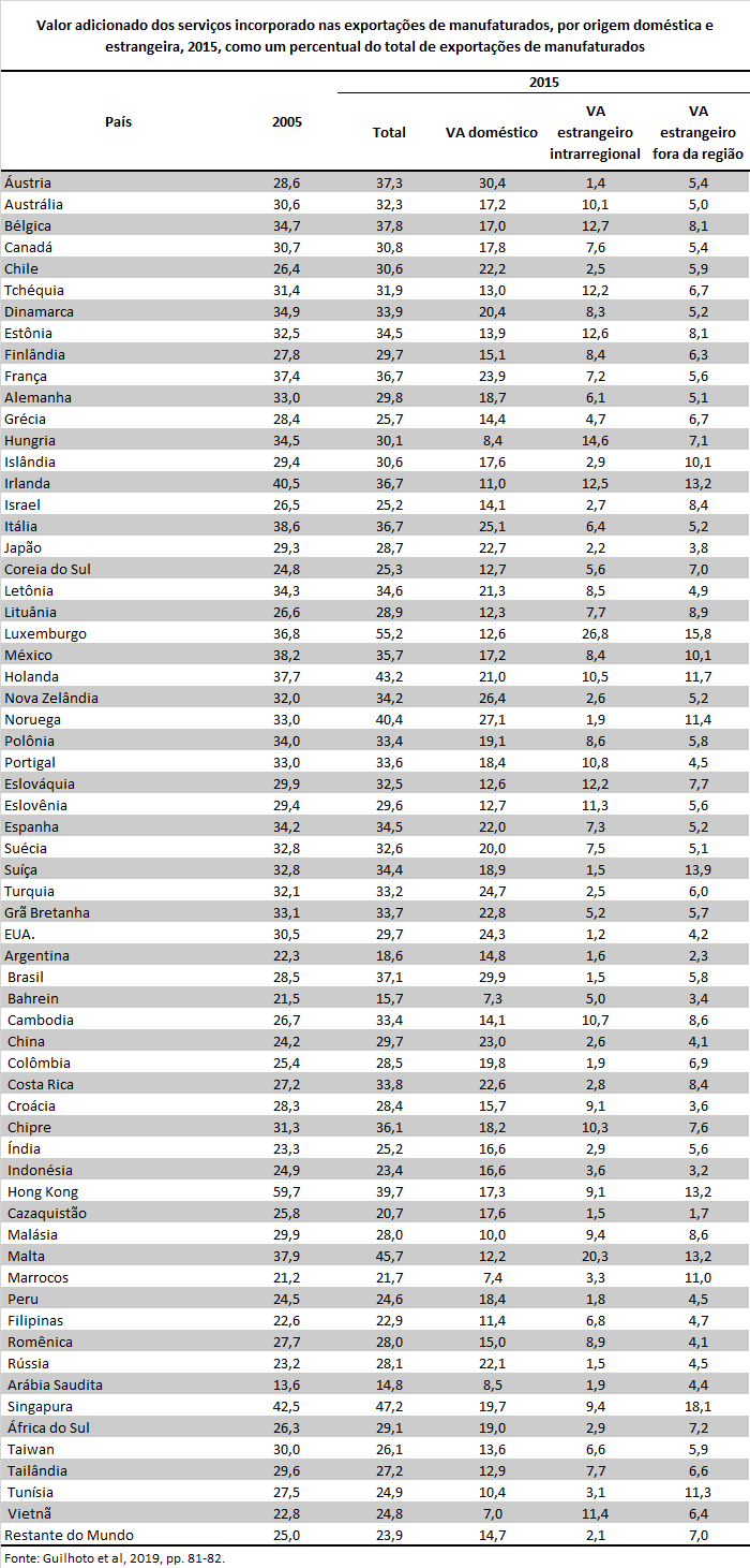 Assim, de 2005 a 2015, na maior parte dos países, o valor adicionado dos serviços contidos nas exportações de manufaturas cresceu. Em Luxemburgo, foi de 37% para 55%, em Singapura de 43% para 47%, na Noruega de 33% para 44%, na Holanda, de 38% para 43%, na Austrália de 29% para 37%, no Chile de 26% para 31%, na Bulgária de 27% para 33% e no Brasil de 29% para 37%.