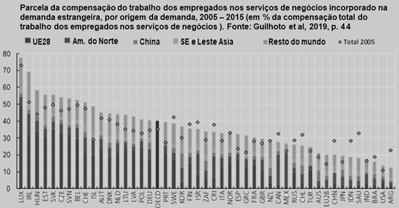 Analogamente, o percentual da remuneração do trabalho no setor de serviços incorporado na demanda externa (sobre o total das compensações do trabalho em serviços de negócios em cada país) aumentou mundialmente de 2005 para 2015, mas diminuiu no Brasil. Enquanto a média da OCDE subiu de de 35,1% para 40%, a brasileira caiu de 18,9% para 16,1%. Não pode ignorar o fato de que a redução no caso brasileiro muito provavelmente foi influenciada pela crise econômica vivida pelo país em 2015.