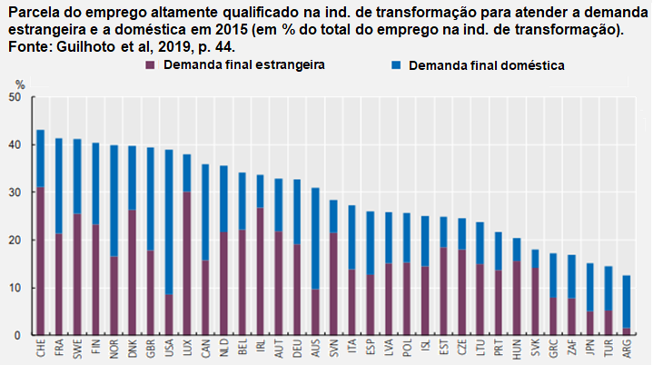 No emprego altamente qualificado em relação ao emprego total na indústria de transformação, entre 30% e 40% em algumas das maiores economias mundiais em 2015 (exceto Japão, Espanha e Itália), nota-se que a parcela da demanda final estrangeira supera a doméstica na maioria dos países, sendo EUA e Japão as exceções mais importantes.