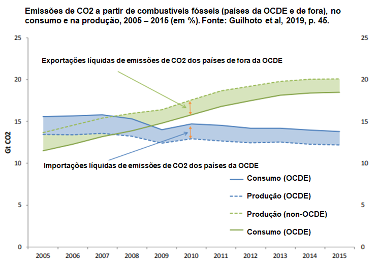 Assim, ao menos para o conjunto da OCDE, embora venham conseguindo dissociar as emissões baseadas na produção do crescimento econômico ao transferirem uma parte de sua produção doméstica para outros países, as emissões que voltam pela “porta dos fundos”, na forma de importações intensivas em carbono, também têm ficado menor.