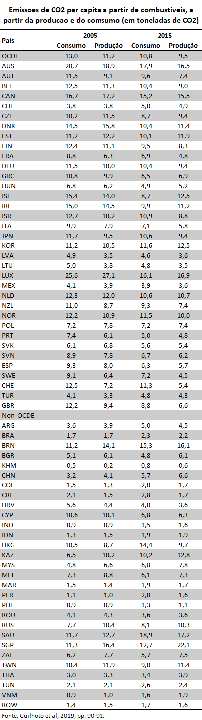 As emissões de CO2 per capita no Brasil estão entre as mais baixas da amostra de países, de 2,3 toneladas no consumo e 2,2 toneladas na produção em 2015 (tendo sido 1,7 em ambos em 2005). Para efeito de comparação, a média das emissões de CO2 per capita na OCDE em 2015 foi 10,8 toneladas no consumo e 9,5 toneladas na produção.