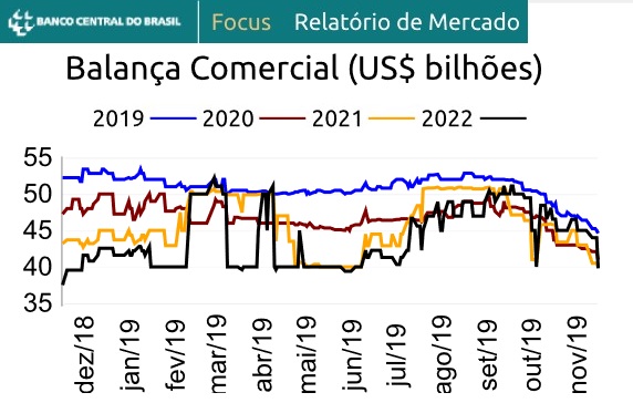 No caso da balança, o Focus vem atualizando para baixo  também para 2020, 2021 e 2022.