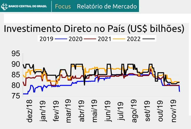 O mercado também reduziu expressivamente a previsão de investimento estrangeiro direto no Brasil, tanto para este ano quanto para os próximos. Para este ano, prevê-se a entrada de US$ 77 bilhões, 3 bilhões a menos que na semana anterior.