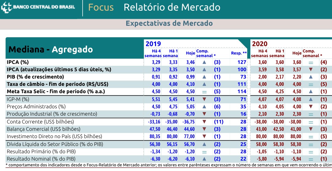 O PIB brasileiro para este ano, segundo o mesmo boletim, deve crescer 0,99%; uma previsão um pouco melhor que a realizada na semana anterior, que foi estimada em 0,92%.