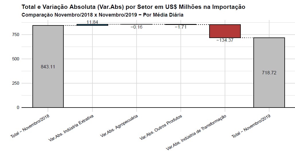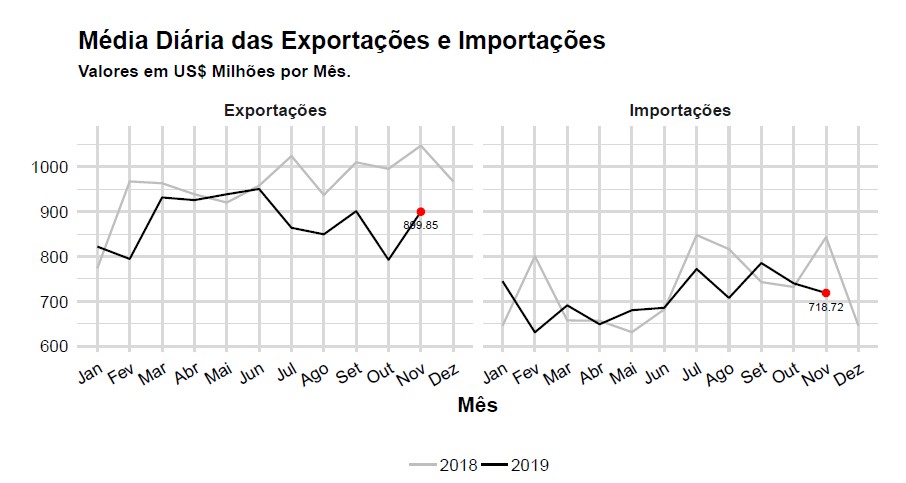 Em relação às importações houve queda de -14,8% na comparação entre as médias até a 4ª semana de Novembro/2019 (US$ 718,72 milhões) com a do mês de Novembro/2018 (US$ 843,11 milhões).