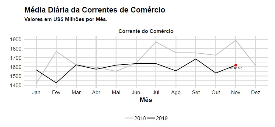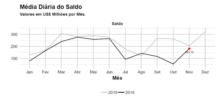 Na 4ª semana de Novembro de 2019, a balança comercial registrou superávit de US$ 0,485 bilhões e corrente de comércio de US$ 7,077 bilhões, resultado de exportações no valor de US$ 3,781 bilhões e importações de US$ 3,296 bilhões.