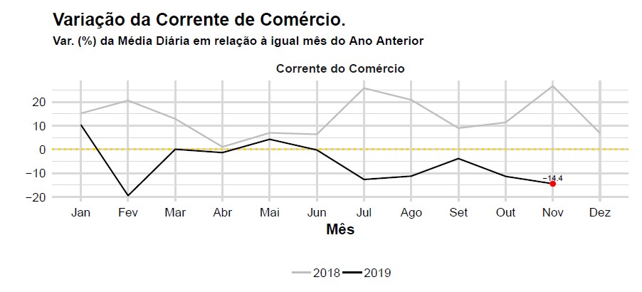No acumulado até a 4ª semana do mês de Novembro/2019, comparando com igual mês do ano anterior, o desempenho dos setores pela média diária foi o seguinte: crescimento de US$ 1,02 milhões ( 0,6%) em Agropecuária; queda de US$ -53,08 milhões (-24,9%) em Indústria Extrativa e queda de US$ -97,56 milhões (-15,2%) em produtos da Indústria de Transformação.