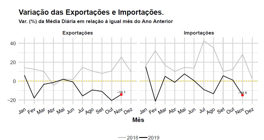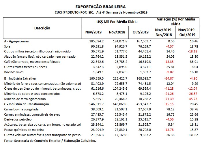 Nas exportações de todos os produtos, comparadas as médias até a 4ª semana de Novembro/2019 (US$ 899,85 milhões) com a de Novembro/2018 (US$ 1.046,95 milhões), houve queda de -14,1%.