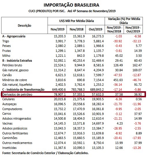 Segundo dados preliminares da Secretaria de Comércio Exterior, a média diária dos gastos com importação de derivados de petróleo bateu recorde em novembro, atingindo US$ 79 milhões/dia, alta de quase 40% tanto em relação ao mês anterior como em relação ao mesmo mês de 2018.