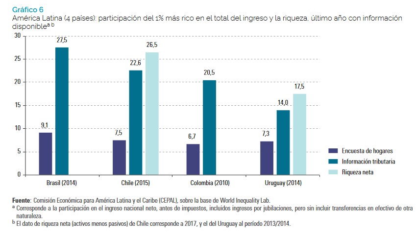 Por exemplo, no Brasil, em 2014, a participação do 1% mais rico no total da renda do país alcançava 9,1%, de acordo com as pesquisas em domicílios, percentual que subia para 27,5%, levando em consideração as informações fiscais. No Chile (dados de 2015), a participação do 1% mais rico na renda total, também medida pelas pesquisas em domicílio, atingia 7,5%, proporção que subia para 22,6%, considerando as informações dos registros fiscais e para 26,5% no caso da riqueza líquida (ativos financeiros e não financeiros menos passivos) e no Uruguai (dados de 2014) as proporções também aumentam: 7,3% (com pesquisas em domicílio), 14% (informações fiscais) e 17,5% (riqueza líquida).