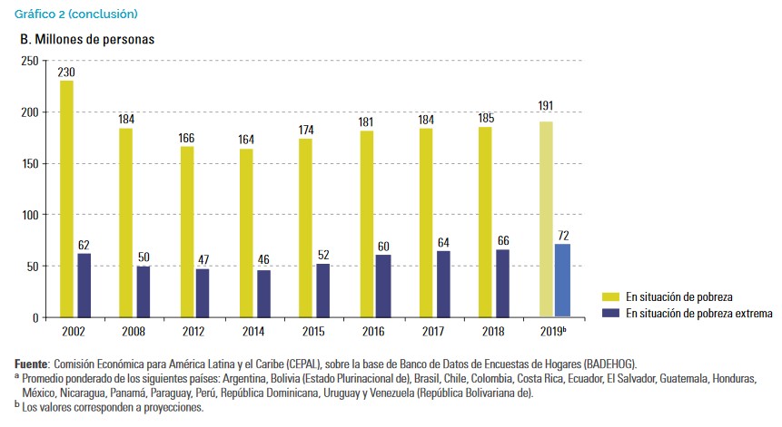 Isso significa que aproximadamente 185 milhões de pessoas estavam abaixo da linha da pobreza em 2018, das quais 66 milhões estavam na extrema pobreza, indica o Panorama Social da América Latina 2019. Em 2019, o número de pessoas na pobreza aumentaria para 191 milhões, dos quais 72 milhões estariam na extrema pobreza. Destaca-se, nessa evolução, o fato de que praticamente todas as pessoas que são somadas às estatísticas de pobreza desse ano se integram diretamente à extrema pobreza.