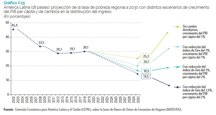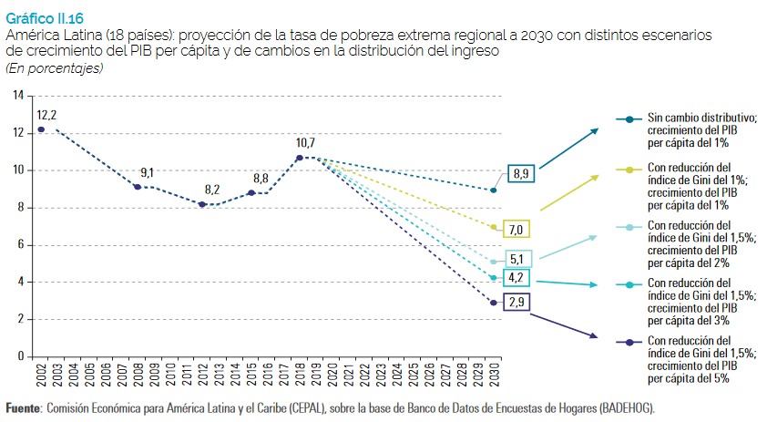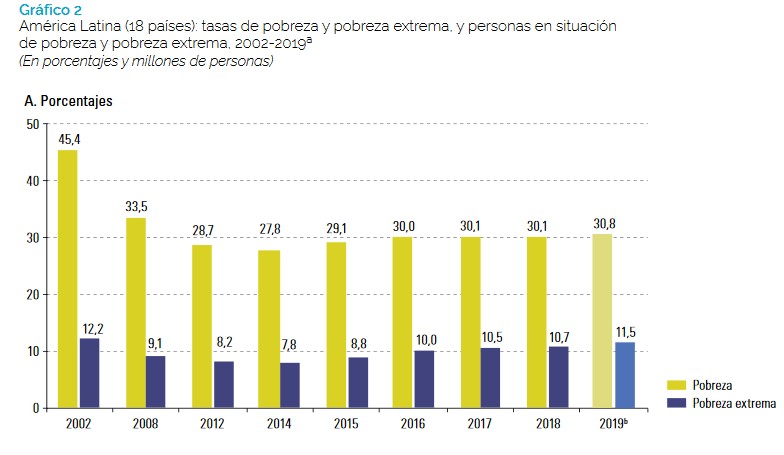Confirmando a tendência ao aumento apresentado desde 2015 na América Latina, 30,1% da população da região estava abaixo da linha da pobreza em 2018, enquanto 10,7% vivia em situação de extrema pobreza, taxas que aumentariam para 30,8% e 11,5%, respectivamente, em 2019, segundo projeções da CEPAL.