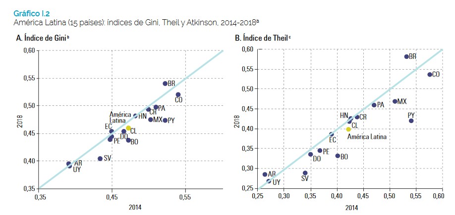 O estudo da CEPAL também aponta que a desigualdade na distribuição de renda – expressa no índice de Gini com base nas pesquisas em domicílio – continuou sua tendência de queda (em média, caiu de 0,538 em 2002 para 0,465 em 2018 em 15 países), mas em um ritmo menor do que nos últimos anos: enquanto entre 2002 e 2014 diminuiu 1,0% ao ano, entre 2014 e 2018 a queda foi de 0,6% ao ano. No entanto, se o índice de Gini for corrigido usando outras fontes de informação, capazes de captar melhor a renda do 1% mais rico, observa-se que a desigualdade é mais elevada e a tendência de declínio é atenuada em comparação com a estimada somente a partir das pesquisas em domicílio.