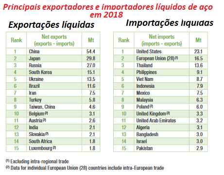 Na tabela dos principais exportadores líquidos (exportação menos importação) de aço, o Brasil figura em sexto lugar, depois de China, Japão, Rússia, Coréia do Sul e Ucrânia.